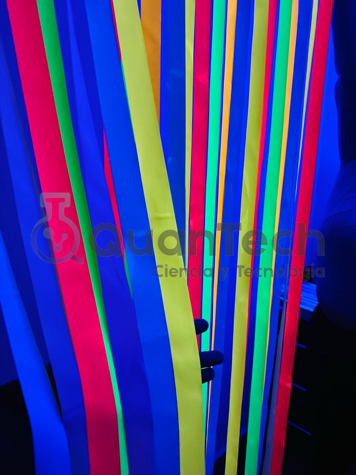 Cortina diseñada en 23 tiras de 5 colores que resaltan con luz ultravioleta, para uso en salas sensoriales.